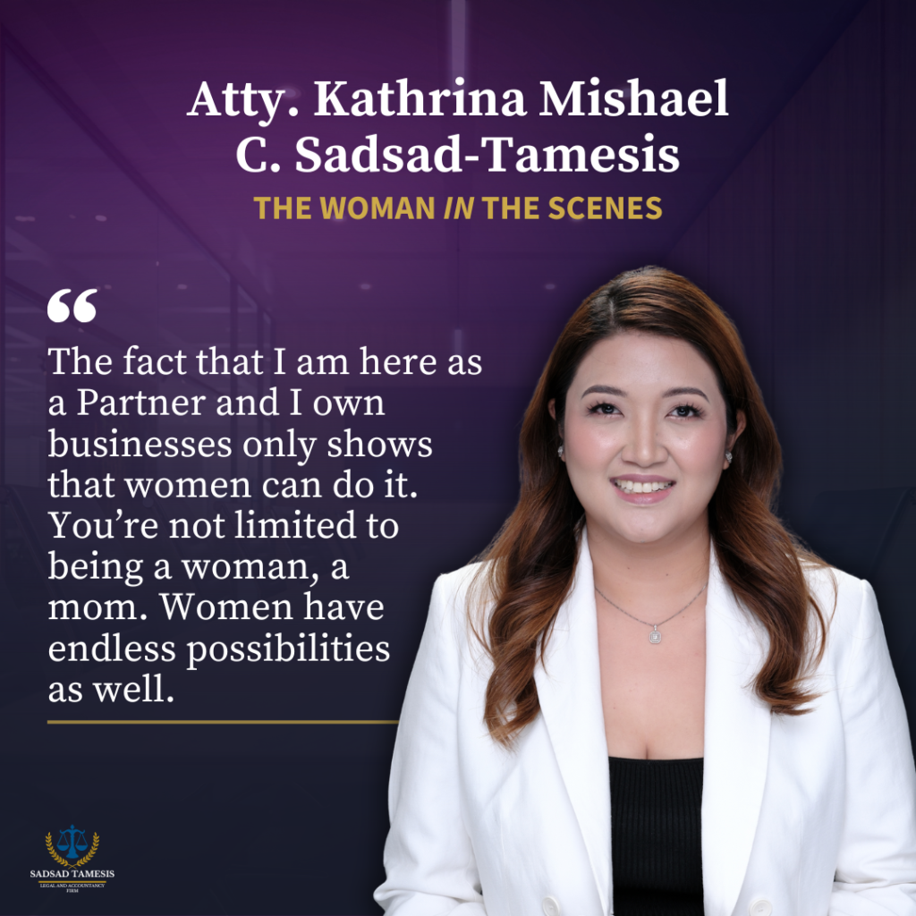 A woman to herself, a lawyer, a boss, an entrepreneur, and a mom—all these things define her. To her, it’s because women have endless possibilities and she chooses to do and have it all for her happiness, even if society may think otherwise. Graduated in the top 5 from the University of Santo Tomas (UST) Faculty of Civil Law and with a Master’s Degree in Entrepreneurship from the Ateneo Graduate School of Business, Atty. Kathrina Mishael C. Sadsad-Tamesis specializes in litigation, specifically civil and criminal litigations, with a focus on family law, adoption, guardianship, nullity of marriage and legal separation, and judicial recognition of foreign divorce. Known as Atty. KCS to the firm, Sadsad-Tamesis is a Partner of Sadsad Tamesis Legal and Accountancy Firm (STLAF) and the CEO of Metro.KST Enterprises, Corp., (MKST), the flagship company of her two operating businesses: the Massagedaily.ph and Metrobaby.ph. “For me, it’s just [about] finding the right balance,” she said in an interview. “It’s basically how you see your happiness and how you balance it. […] Life is hard and it’s hard to balance [responsibilities] but at the end of the day, you will [be the one to] choose. Ikaw yung pipili. Choose your happiness and accept the consequences of your choices.” Women in Law One of her sources of happiness comes from the fulfillment of helping people and winning cases for her clients as a lawyer, which has always been her dream job. After passing the Bar Examination in 2013, she worked as a corporate lawyer of several groups of companies, then practiced in PricewaterhouseCoopers (PwC) Philippines, an audit and tax firm. However, it is only in her third job where she practiced litigation as a junior associate that she truly enjoyed her work. “I enjoy meeting people, going to court, appearing before the judges and solving other people’s cases. When I win a case, I’m very happy,” said Sadsad-Tamesis. “Whether I’m for the accused or the complainant, for me, it’s like a puzzle. You solve it, you look into the details. Tignan mo kung ano yung defenses mo, or saan yung mga matters na malakas ka and you solve it. I love the challenge and I enjoy doing it the most.” In 2016, Sadsad-Tamesis and fellow Partners formed a law firm in Bulacan—the De Guia, Tamesis & Sadsad Law Firm, which was more of a part-time job to them. When she got pregnant and had a hard time going to her then-job, she resigned and focused her efforts towards their law firm. Around 2019, she and her husband, Atty. Chris Tamesis decided to open another law firm in Quezon City—the STLAF. “Why? Because that’s what I wanted to do. Dun ako nag-e-enjoy. That’s the job that motivates me to wake up in the morning […] That’s what inspires me the most.” This is especially true when it comes to family law cases, her specialization. “Favorite ko yung family law because it gives you a sense of fulfillment once you resolve the case,” she beamed. “For me kasi, lawyering is not just about getting money, it’s about helping other people [too].” For her, it’s the connection with the clients that matter. “It’s full of emotions. Mas masaya, actually. Iba yung connection sa client in family law cases because you get to know them,” explained Sadsad-Tamesis, specifically pertaining to annulment and adoption cases. “Nase-serve yung purpose ko as a lawyer, as a woman.” Lawyering, like other careers, is not just for men; it hasn’t been for a long time now, she emphasized. For her, the legal industry has evolved to not only recognize but also showcase women’s excellence. “When I was in law school, mas marami nang babae […] Before kasi diba, parang pag lawyer, mostly lalaki. But for me, ngayon, nagiging pantay na,” she recalls. “Sa MTC, RTC, ang dami nang babaeng judges. So talagang pantay na for me. Lawyering is really [not just] for men, it’s also for women and maraming nag-e-excel na mga babaeng lawyers. Women in Business A respected lawyer in the firm, Sadsad-Tamesis is also an entrepreneur and CEO of the fast-growing company MKST. MKST houses Massagedaily.ph (MDPH), a home service spa with 39.5k followers on Facebook and Instagram, and its events division, the Luxe Lounge by MDPH. “I really love massages since college. I also grew up kasi na merong nagho-home service sa bahay namin for my lola,” told Sadsad-Tamesis, recalling her memories. “[Although], before di ako fan ng home service; I go to the spa mismo. Then may isang beses, we tried home service and really liked it since you don’t have to travel home after getting your massage.” According to her, it’s convenient and effort-efficient. However, because of demand, her favorite home service spa was always fully booked, so she thought, why not take advantage of it? “Parang naisip ko, ‘Edi ako na lang mag-p-provide’. Naisip ko, ako na lang magbu-buo ng business na yon. I’ll build my own home service spa,” she chuckles. “Feeling ko meron [kasing] malaking market na hindi nase-serve…” On navigating leadership and decision-making As a Partner lawyer and CEO of a business, Sadsad-Tamesis approaches leadership and decision-making with professional finesse, consideration, and proficiency. Between the top-to-bottom and bottom-to-top strategy, she prefers the former. “For me kasi mas mabilis yung top-to-bottom, communication is more direct and efficient but at the same time, I am still making sure that the decision is okay with everybody, hindi yung I’ll decide and impose. I do not want to impose on my people kung anong gagawin nila, I want to still give them the freedom to suggest and I honestly listen to those suggestions.” Sadsad-Tamesis greatly values her people’s perspectives and inputs. To her, they are the heart of an organization. “People [who] compose our organization, I believe, is the heart of the organization, not the leader. Kumbaga, ikaw leader ka, kung wala ka namang 